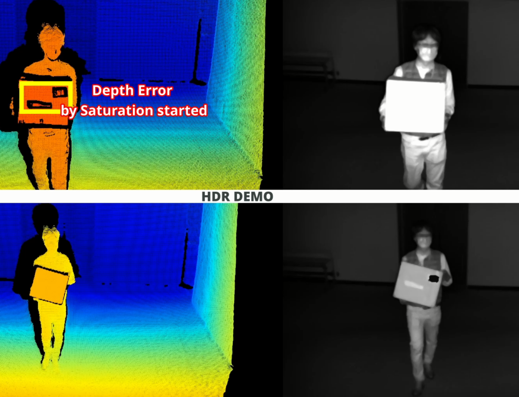 We would like to introduce one of the High Dynamic Range (HDR) techniques that can be achieved with our 3D Time of Flight (ToF) sensor.