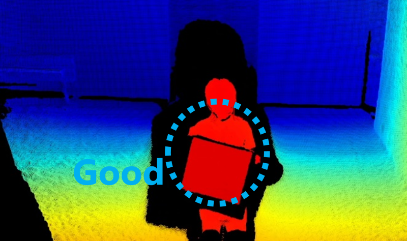 As the person gets closer to the camera, IR signal saturation causes inaccurate distance calculations, resulting in depth data degradation.