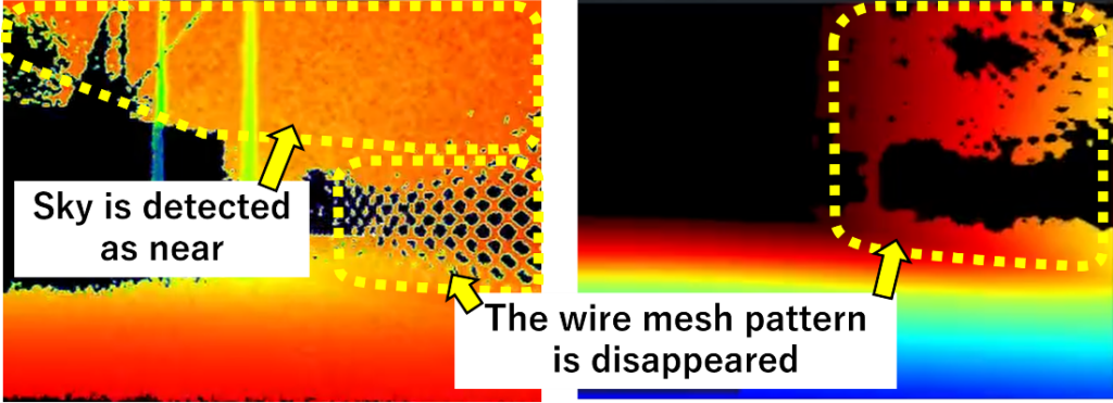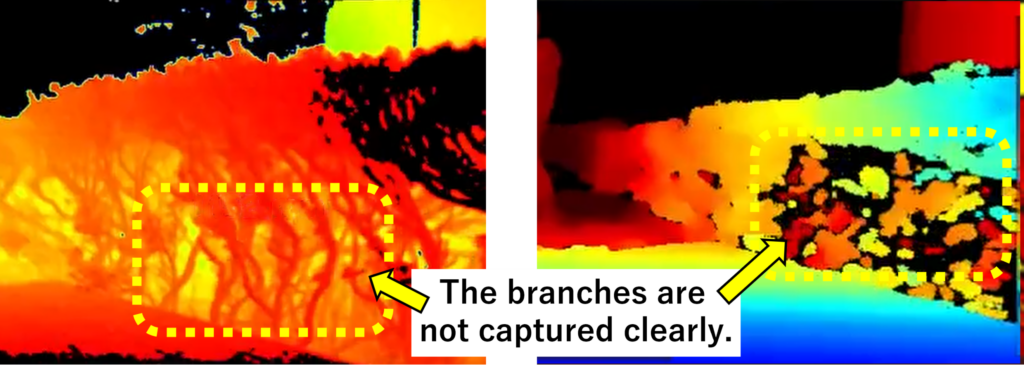 In this short demonstration video, these cameras mounted on a moving cart (simulating a robot) travels along a walkway. The video shows that due to measurement errors, the Camera B (Company B @video) was difficult to capture fine details of plants and leaves, while senSPure™ C11U precisely captured in real time.